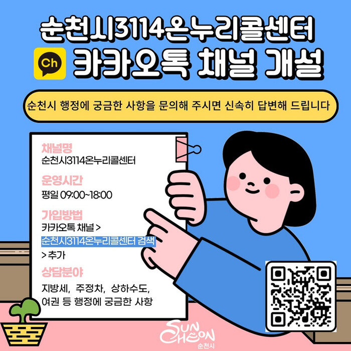[순천=이문석 기자] 전남 순천시는 오는 2월3일부터 시민들과 더 쉽고 편리하게 소통하기 위해 순천시3114온누리콜센터 카카오톡 상담 서비스를 운영한다고 밝혔다.