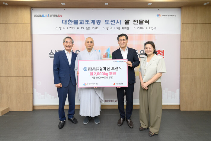 서울 양천구가 최근 대한불교조계종 직할사찰인 도선사로부터 600만원 상당의 쌀(10kg) 200포를 전달 받았다. 사진은 이 구청장(오른쪽 두 번째)이 관계자들과 기념 촬영을 하는 모습. (사진=양천구청 제공)