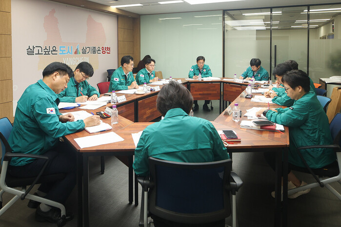 서울 양천구 29일 구청 5층 회의실에서 국가정보자원관리원 화재에 따른 전산망 장애 대응방안을 논의하기 위한 긴급회의를 개최했다. 사진은 이기재 구청장이 회의를 주재하는 모습. (사진=양천구청 제공)