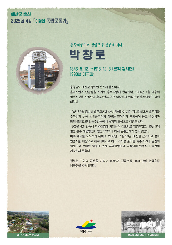 [예산=김의석 기자]충남 예산군은 홍주의병으로 적극 활동 중인 광시면 은사리 출신 박창로 독립운동가를 ‘2025년 4월 이달의 독립운동가’로 선정했다고 밝혔다.