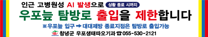 군 관계자는 “이번 조치는 고병원성 조류인플루엔자(AI) 확산을 방지하고, 지역주민과 탐방객의 안전을 최우선으로 고려한 조치다”라며, “우포늪 탐방로 출입제한으로 인한 불편에 대해 양해를 부탁드리며, 조속히 탐방로를 개방할 수 있도록 최선을 다하겠다”라고 전했다.
