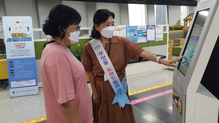 서울 마포구는 최근 구민의 편의성을 높이고 직원의 근무환경을 개선하고자 종합민원실 환경개선 작업을 완료했다. 민원대를 전면 교체해 이동이 불편한 사회적 약자의 편의성을 높이고 직원 전용 책상의 간격을 넓히는 등 직원 사무공간을 개선했다. 사진은 워킹가이드가 민원인을 돕고 있는 모습. (사진제공=마포구청)