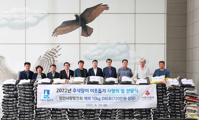 경기 수원시 장안구는 지역 대표 봉사단체인 ‘장안사랑발전회’로부터 29일 추석을 맞아 지역내 소외계층에 720만원 상당의 쌀(10kg) 240포를 기부받았다. 함께 자리한 수원새마을금고에서도 600만원 상당의 쌀(10kg) 200포를 전달했다. 사진은 전달식에서 최상규 구청장(오른쪽 다섯 번째)과 관계자들이 기념촬영을 하는 모습. (사진제공=장안구청)