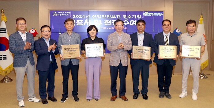 | ▲ 고광완 광주광역시 행정부시장(오른 쪽부터 네 번째)이 9일 오후 시청 3층 비즈니스룸에서 열린 ‘산업안전보건 우수기업 인증서 수여식’에 참석해 우수기업 인증서를 수여한 후 기념촬영을 하고 있다. / 광주광역시 제공 |