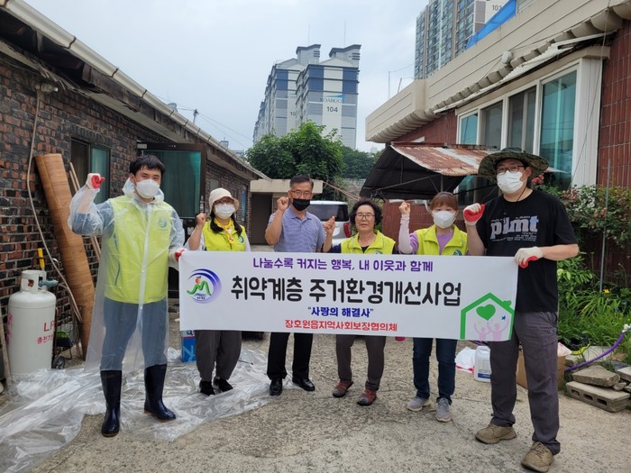 경기 이천시 장호원읍지역사회보장협의체는 최근 장호원읍 지역내 홀몸노인 취약계층을 위한 ‘사랑의 해결사’ 주거환경개선사업을 진행해 주방 페인트 작업과 싱크대 교체해 쾌적한 주방 환경을 조성했다. 사진은 협의체 위원들이 기념촬영을 하고 있는 모습. (사진제공=이천시청)