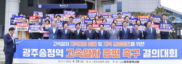 | ▲ 강기정 광주광역시장(앞줄 가운데)이 24일 오전 광산구 송정역 광장에서 열린 '광주 송정역 고속열차 증편 촉구 결의대회'에 참석해 이병훈 더불어민주당 시당위원장, 지역 국회의원, 구청장, 시민 등과 KTX 증편을 촉구하며 구호를 외치고 있다./광주광역시 제공 |