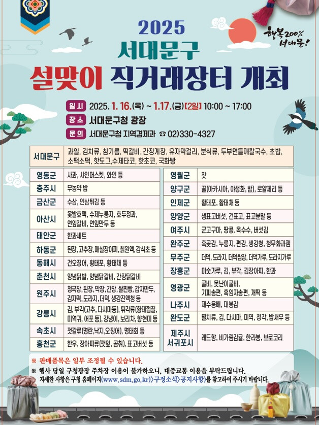 ‘2025 서대문구 설맞이 직거래장터’에 대한 자세한 내용은 서대문구청 지역경제과로 문의하면 된다.