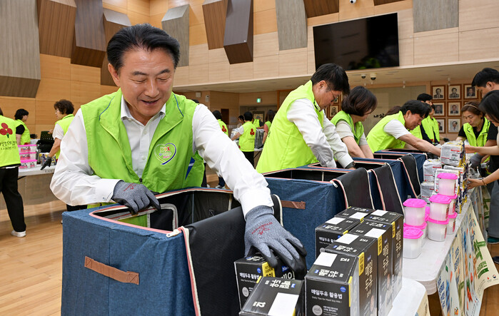 경기 의정부시가 최근 시청 대강당에서 취약계층의 여름나기를 지원하는 ‘희망여름 착!착!착! 나눔 캠페인’을 실시했다. 사진은 김동근 시장이 캠페인에 참여해 물품 꾸러미를 준비하는 모습. (사진=의정부시청 제공)