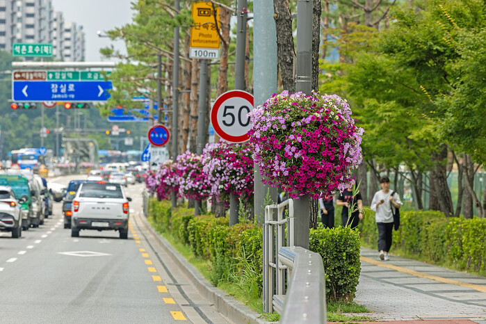 4월에는 오금로, 백제고분로 등 8개 주요 도로에 걸이형 화분 700여개를 내건다. 더 많은 구민이 봄 정취를 만끽하도록 도로 폭이 넓고 유동 인구가 많은 지하철역 근처에 촘촘히 설치해 효과를 높인다. 잠실호수교 전망쉼터 등 주요 거리에도 봄 정취를 더할 대형 꽃 화분을 비치한다.