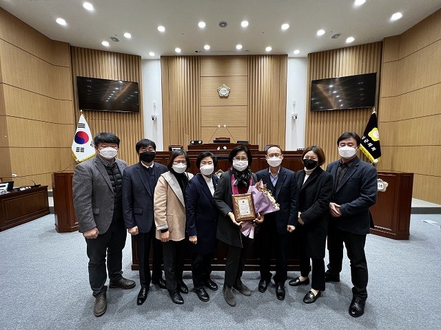 | ▲ 민경매 해남군의원(사진 가운데)이, '2021 올해의 인물 대상' 시상 최우수 의정대상을 수상하고 동료 의원 및 군의회 관계자들과 기념촬영을 하고 있다. / 해남군의회 제공. |
