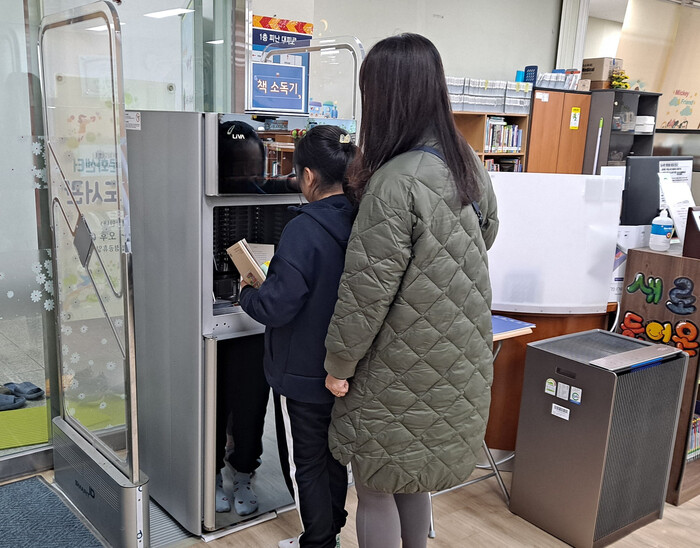 | ▲ 이문체육문화센터 어린이도서관에서 모녀 이용자가 책 소독기를 사용하고 있다. (사진=동대문구청 제공) |