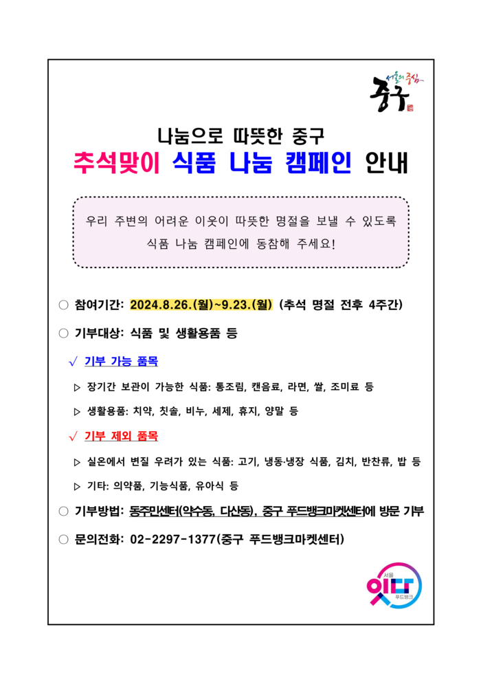 [시민일보 = 여영준 기자] 서울 중구가 추석을 앞두고 지역내 소외된 이웃을 돕기 위해 '2024 추석맞이 식품 나눔 캠페인'을 전개하고 있다.