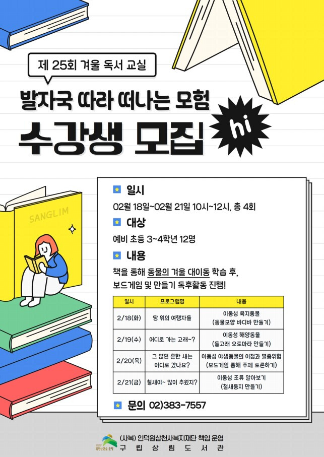 [시민일보 = 이대우 기자] 은평구(구청장 김미경)는 구립상림도서관이 제25회 겨울 독서 교실 ‘발자국 따라 떠나는 모험‘을 운영한다고 밝혔다.