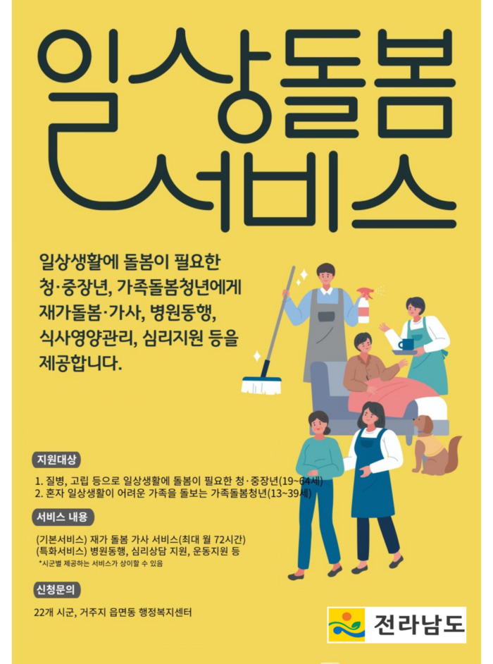 [남악=황승순 기자] 전남도는 돌봄이 필요한 청ㆍ중장년(19~64세)과 가족돌봄청년(13~39세)에게 돌봄서비스를 지원하는 일상돌봄서비스 사업을 이달부터 본격 시행한다고 밝혔다.