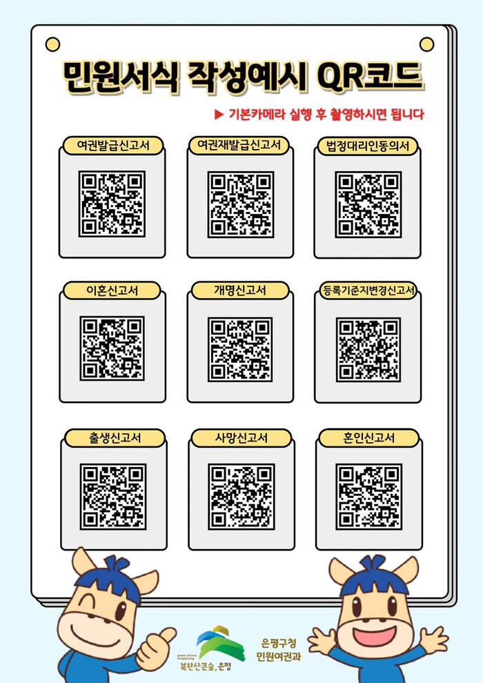 이번 큐알(QR)코드 배포는 자주 사용되거나 작성이 어려운 민원 서식의 작성 예시를 제공함으로써 민원인의 불편을 해소하고 민원인의 대기 시간을 단축하기 위한 것이다. 큐알(QR)코드는 은평구청 민원여권과와 16개 동 주민센터 민원실에 비치돼 있다.
