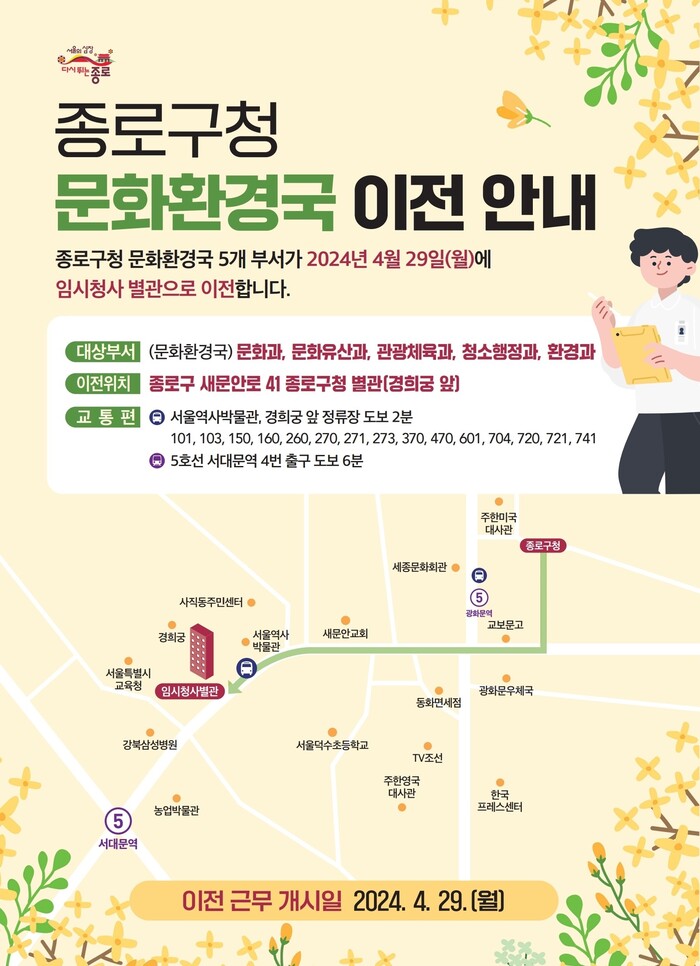 정문헌 구청장은 “임시청사 별관 운영으로 인한 주민 불편과 혼란을 최소화할 수 있도록 철저히 대비하겠다”라며 “신청사 건립은 종로의 새로운 도약을 위한 필수 과정으로 오랜 시간 공들여 준비하고 있는 만큼, 임시청사 이용이 다소 불편하시더라도 구민 여러분들의 양해를 부탁드린다”고 말했다.