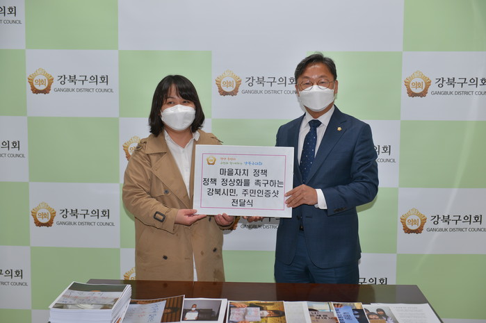 이날 '마을자치정책 정상화를 위한 강북시민행동을 대표해 구의회에 인증샷을 전달한 최인정 강북구 마을자치 센터장은 "강북구에 마을공동체, 주민자치 정책이 잘 뿌리내릴 수 있도록 많은 노력을 부탁드린다"고 전했다.