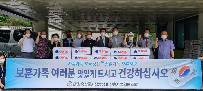 서울 성동구는 28일 호국·보훈의 달을 맞이해 국가유공자와 유족들에 대한 예우와 감사의 마음을 전하고자 마장축산물시장상점가 진흥사업협동조합 주관으로 보훈가족 400명을 대상으로 고기 나눔 행사를 했다. 사진은 행사에서 정원오 구청장(오른쪽 다섯 번째)과 관계자들이 기념촬영을 하는 모습. (사진제공=성동구청)