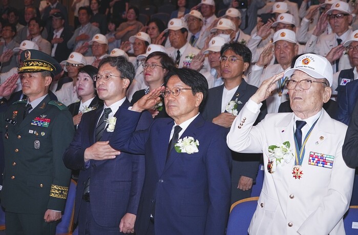 | ▲ 강기정 광주광역시장이 25일 남구 빛고을시민문화관에서 열린 ‘6·25전쟁 제74주년 기념식’에 참석해 참전유공자 등 내빈들과 국민의례를 하고 있다./광주광역시 제공 |