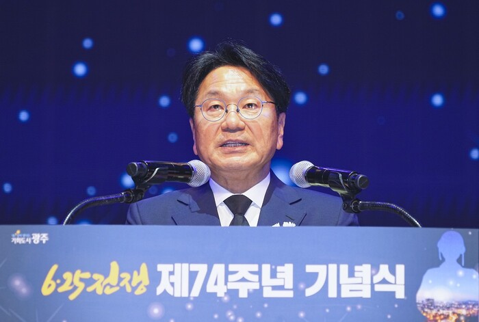 강 시장은 이날 오전 빛고을시민문화관에서 열린 제74주년 6·25전쟁 기념식에서 “북·러의 상호방위지원 선언으로 한반도는 다시 신냉전의 최전선이 될 상황이 되는 등 남북 긴장 고조와 국제사회의 전쟁은 전 세계의 경제와 평화를 파괴하고 있다”며 “광주와 대한민국의 평화와 번영의 기반이 된 참전용사 한 분 한 분의 헌신을 기억하고 후세에 전해 대한민국의 평화를 지켜야 한다”고 이같이 밝혔다.