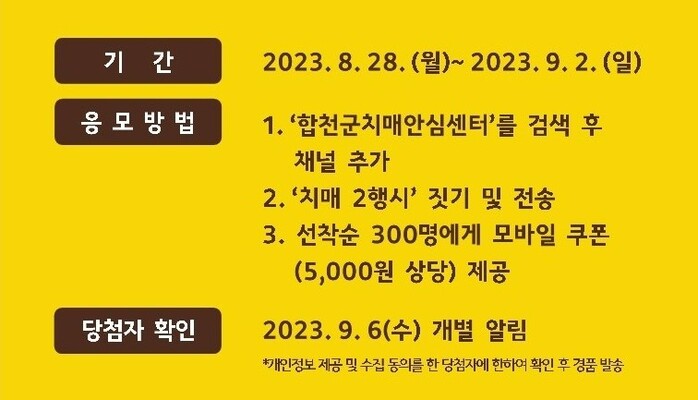 합천군치매안심센터 카카오톡채널 개설 기념 이벤트로 8월 28일부터 9월2일까지 “치매2행시” 를 보내주신 선착순 300명에게 모바일쿠폰(5,000원 상당)을 제공할 계획이며 당첨자는 9월 6일 발표할 예정이다. 채널 이용과 이벤트 참여는 카카오톡 상단 검색창에 ‘합천군치매안심센터’를 검색하고 채널을 추가하면 된다.