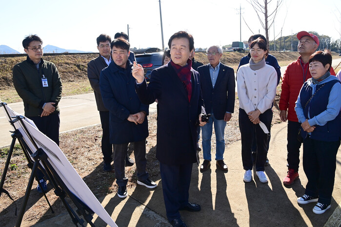 조규일 진주시장은 17일 금산면 와룡지구 남강둔치 일원에 조성 완료된 ‘남강변 친수공간 조성사업(와룡지구)’현장을 점검했다.