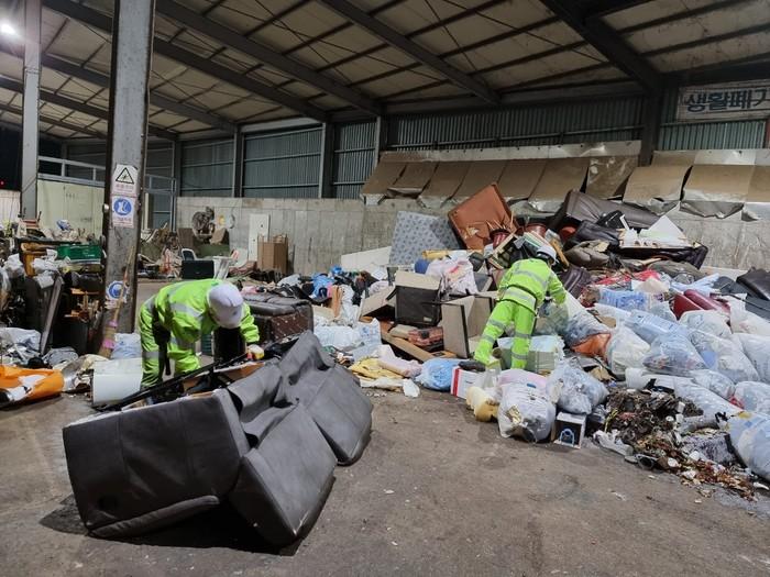 | ▲ 동작구 환경공무관이 공사장에서 발생한 생활폐기물을 성상별로 분류하고 있다. (사진제공=동작구청) |