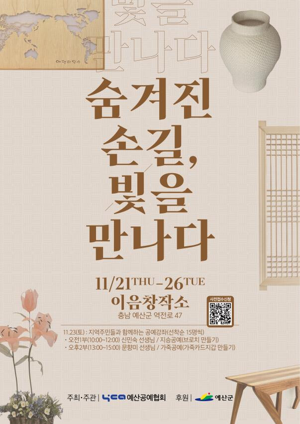 이번 전시회는 2023년 11월23일 공예협회 창립 이후 처음 열리는 정기 전시회로 ‘숨겨진 손길, 빛을 만나다’라는 주제로 공예협회 회원들의 다양한 작품이 전시될 예정이다.