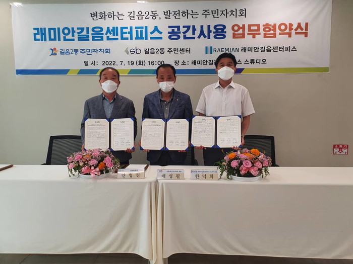 서울 성북구 길음2동 공동주택 래미안길음센터피스 입주자대표회의, 길음2동주민자치회, 길음2동 주민센터는 19일 ‘래미안길음센터피스 유휴공간 사용을 위한 업무협약’을 체결했다. 주요 내용은 공간사용 협약시설(스튜디오 2곳), 협약 기간 등에 관한 사항 등이다. 사진은 협약식에서 관계자들이 기념촬영을 하는 모습. (사진제공=성북구청)