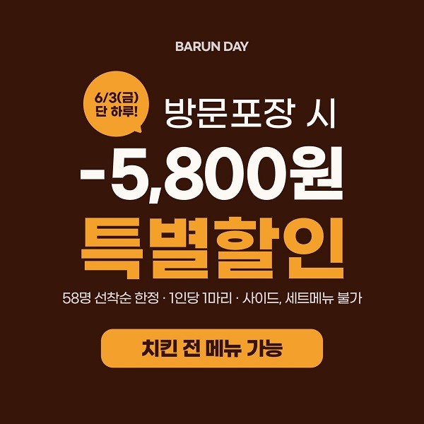 매월 정기적으로 진행되는 ‘바른데이’행사는 인근 바른치킨 전 매장에서 방문포장시에 전 메뉴를 5,800원 할인하는 할인 프로모션이다. 6월 3일 단 하루 동안 진행되며 1인당 1마리만 구매 가능하고 매장 당 58명까지 선착순으로 진행된다.