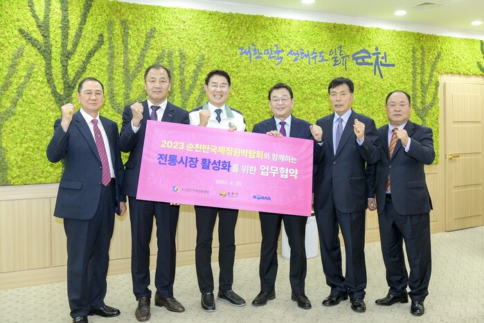 [순천=이문석 기자] 전남 순천시와 소상공인시장진흥공단, 한국철도공사 광주전남본부가 최근 순천시청에서 '2023순천만국제정원박람회와 함께하는 전통시장 활성화를 위한 업무협약'을 체결했다.