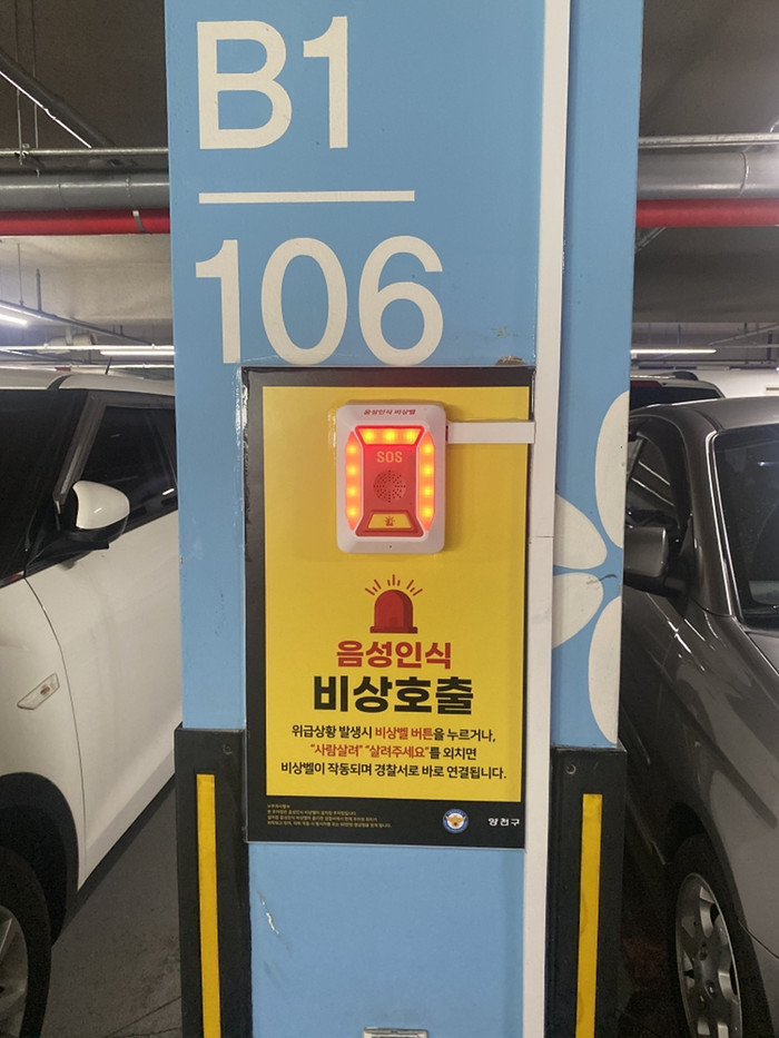 | ▲ 지하 공영 주차장에 음성 인식 비상벨이 설치된 모습. (사진제공=양천구청) |