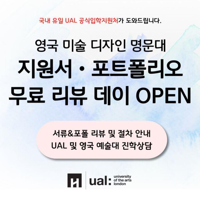 이번 리뷰데이 행사는 2025년 영국 미술디자인 명문 대학교에 유학을 준비중인 지원예정자를 위한 것으로, △50만원 상당의 UAL 및 영국 아트대 지원 서류 무료 검토 △UAL 파운데이션 과정 입학심사비 면제 △영국 미술디자인 대학교 유학을 위한 1:1 무료 상담이 진행된다.