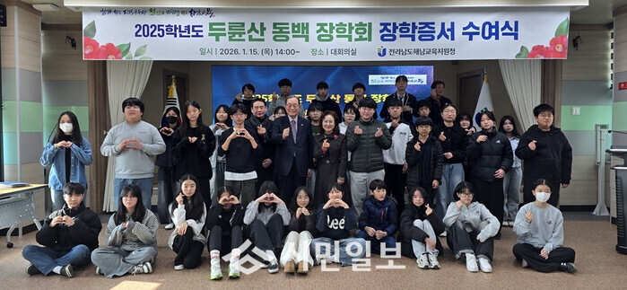 [해남=정찬남 기자] 전라남도해남교육지원청(교육장 조연주)은 지난 15일(목) 오후 2시, 2025학년도 두륜산 동백장학회 장학증서 수여식을 개최하고 지역 학생 39명에게 장학증서를 전달했다.