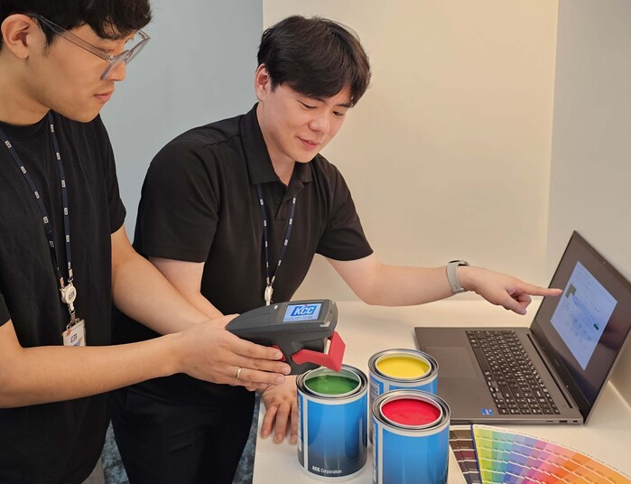 | ▲ KCC 중앙연구소에서 AI 기반의 무도장 조색시스템을 이용해 비접촉 방식으로 액상의 도료를 측색하고 있다 (사진= KCC 제공) |