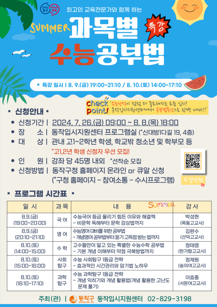 | ▲ 동작구(구청장 박일하)가 여름방학 대비 과목별 수능 공부법 특강을 개최한다. 사진은 특강 홍보 포스터 (사진=동작구청 제공) |