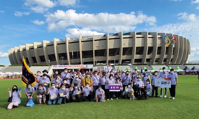 서울 중랑구가 지난 20일 열린 ‘2022 서울특별시장애인생활체육대회’에서 종합 3위를 차지했다. 구는 중랑구장애인체육회를 중심으로 120여명의 선수와 임직원들이 참여했으며 조정·볼링 등 25개 전종목에 참가했다. 사진은 서울특별시장애인생활체육대회에서 중랑구 선수들이 종합 3위를 차지한 뒤 기념사진을 촬영하고 있는 모습.(사진제공=중랑구청)