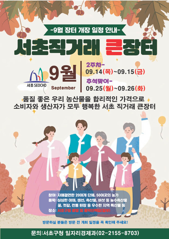 [시민일보 = 이대우 기자] 서울 서초구(구청장 전성수)가 오는 25~26일 이틀간 ‘추석맞이 서초 직거래 큰장터’를 구청 광장과 인근 음악 산책길서 개최한다.