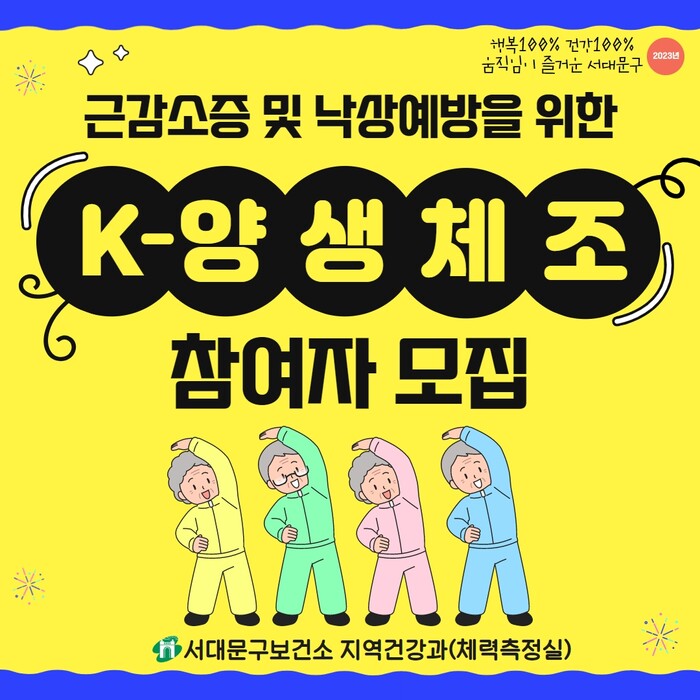 [시민일보 = 홍덕표 기자] 서울 서대문구(구청장 이성헌)가 65세 이상 주민들의 근감소증과 낙상 예방을 위해 오는 9~30일 '시니어 K-양생체조' 프로그램을 운영한다.