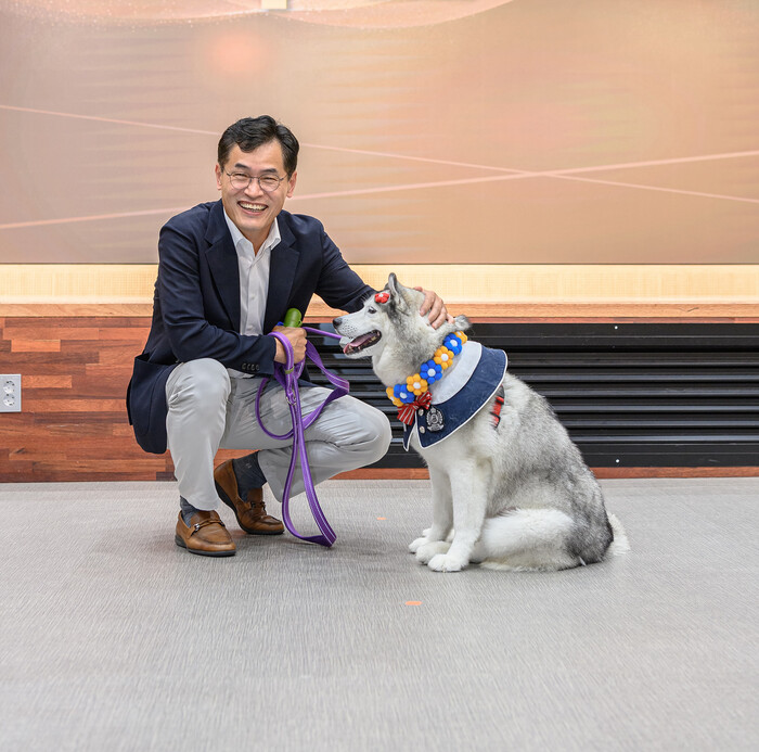 | ▲ 양천구, 홍보견 '부끄'와 교감중인 이기재 구청장.(사진=양천구청 제공) |