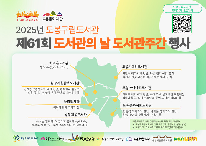 [시민일보 = 문민호 기자] 서울 도봉구(구청장 오언석) 도봉구립도서관이 제61회 도서관의 날(12일)과 도서관 주간(12~18일)을 맞아 다양한 독서문화 행사를 연다.