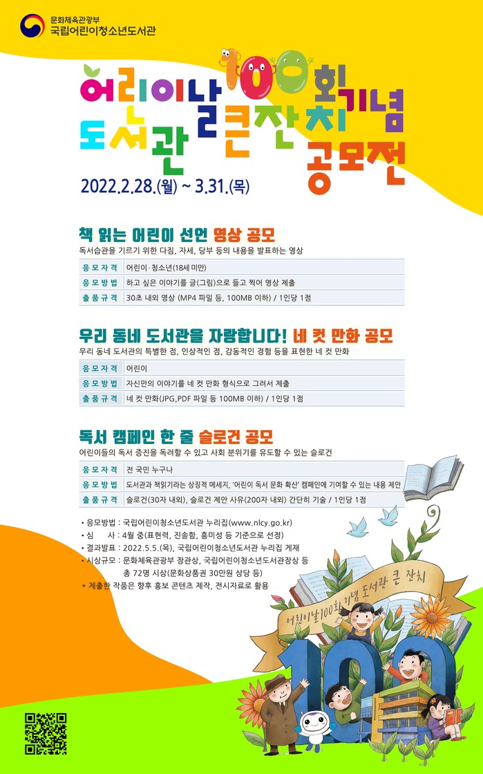 [시민일보 = 이대우 기자] 국립어린이청소년도서관은 28일부터 3월 31일까지 「어린이날 100회 기념 도서관 큰 잔치 공모전」을 개최한다.