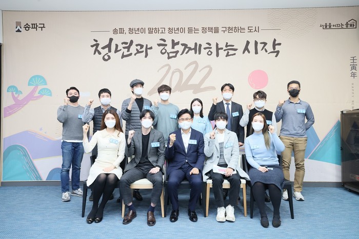 | ▲ 박성수 구청장과 송파구 청년 구직자, 문정비즈밸리 입주기업 청년 대표 등이 함께한 청년 일자리 간담회 ‘청년과 함께하는 시작, 2022!’ 현장(2022.01.07.) (사진제공=송파구청) |