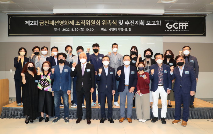 서울 금천구는 최근 ‘제2회 금천패션영화제 조직위원회 출범식’을 개최했다. ‘금천패션영화제’는 국내 최초이자 유일의 패션산업을 주제로 한 영화제다. 사진은 출범식에서 유성훈 구청장(앞줄 가운데)이 기념촬영을 하는 모습. (사진제공=금천구청)