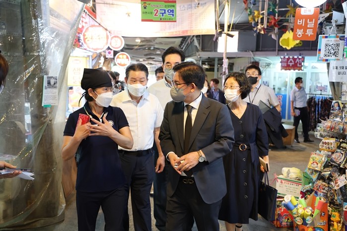 박강수 마포구청장은 27일 아현시장을 방문해 주민과 길거리 현장 소통을 실시했다. 이번 현장소통은 이날 아현동에서 열린 주민간담회 일정 중 하나로 박 구청장은 아현시장 상인과 인근 주민의 의견을 경청했다. 사진은 이날 아현시장을 방문한 박 구청장이 상인의 요청사항을 듣고 있는 모습. (사진제공=마포구청)