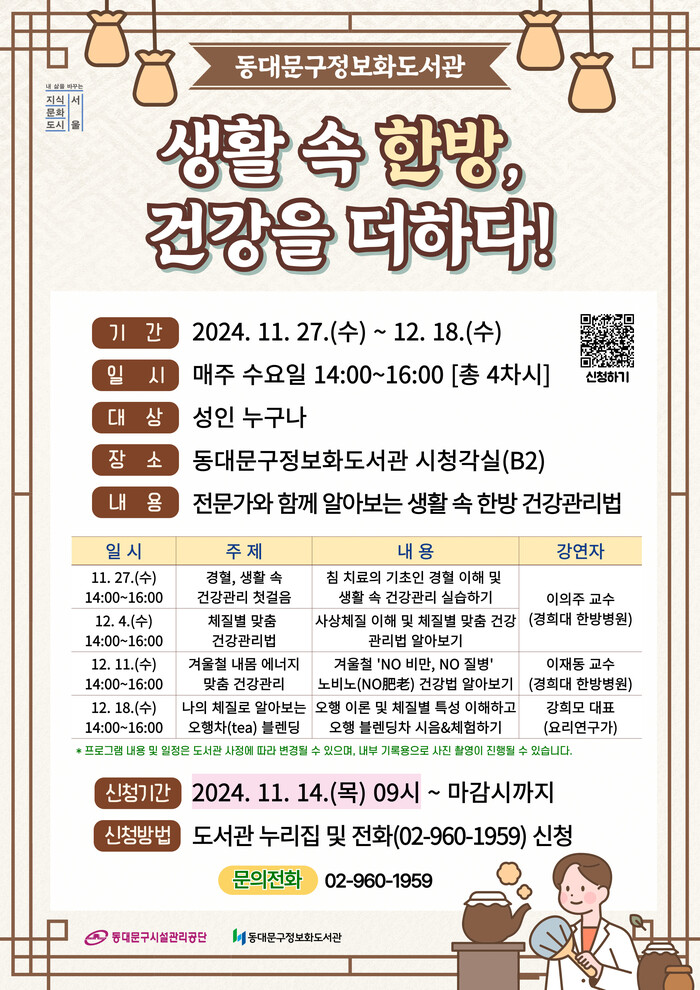 [시민일보 = 이대우 기자] 서울 동대문구시설관리공단(이사장 인택환)에서 운영하는 동대문구정보화도서관이 2024년 겨울을 맞아 지역 주민들이 일상 속에서 실천할 수 있는 한방 건강관리법을 배우고, 자신의 체질에 맞는 건강 관리법을 습득할 수 있는 프로그램‘생활 속 한방, 건강을 더하다!’프로그램을 무료로 운영한다.
