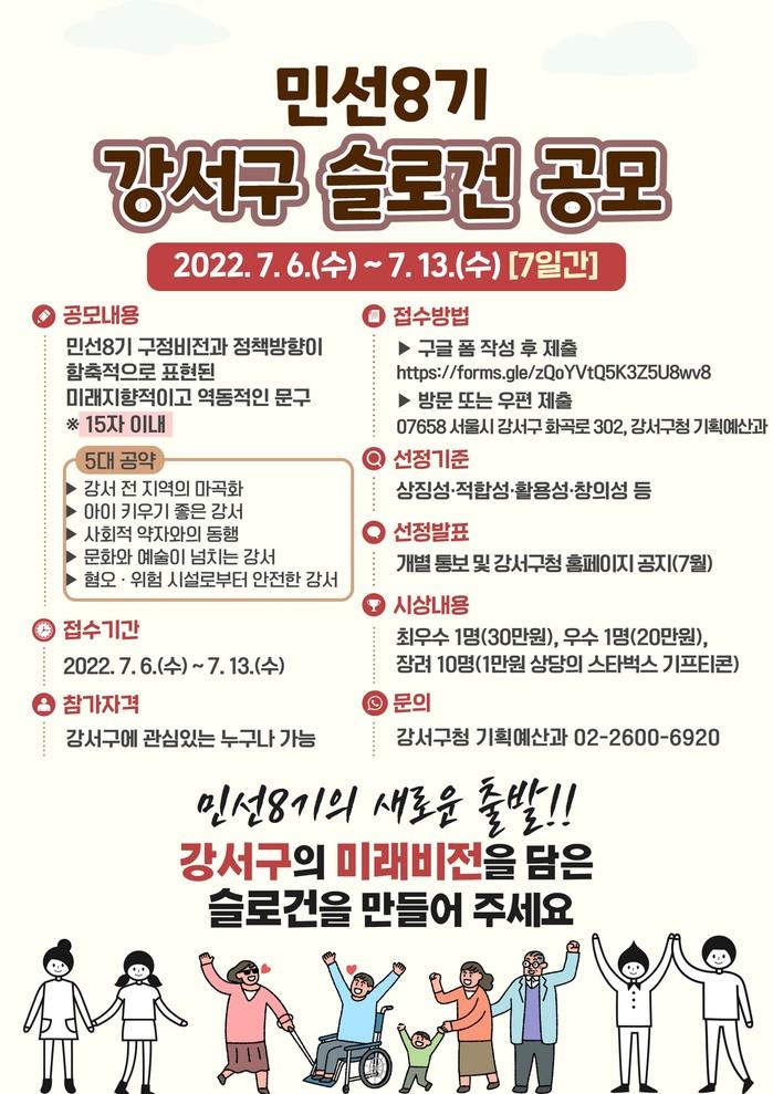 [시민일보 = 홍덕표 기자] 강서구(구청장 김태우)가 새롭게 출범한 민선8기 4년을 함께 할 구의 미래비전을 담은 슬로건을 오는 13일까지 공모한다.