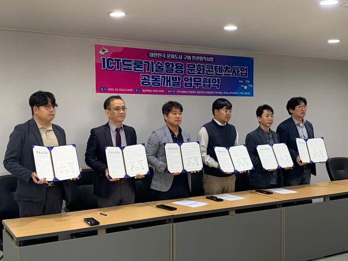 [구미=박병상 기자] 경북 구미시문화도시지원센터는 지난 25일 경운대학교에서 경운대학교 산학협력단, ㈜가이온, ㈜다빈치랩스, ㈜볼로랜드, ㈜브이스페이스, ㈜프리뉴와 함께 대한민국 문화도시 구미 조성을 위한 ICT드론기술활용 문화콘텐츠 공동개발 업무협약을 체결했다.