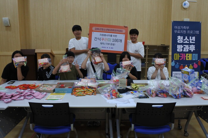 [인천=문찬식 기자] 인천 강화군 청소년방과후아카데미는 최근 아카데미 참여 청소년들이 자원봉사자를 위한 간식 꾸러미 100개를 직접 만들어 인천광역시자원봉사센터에 기부했다고 13일 밝혔다.