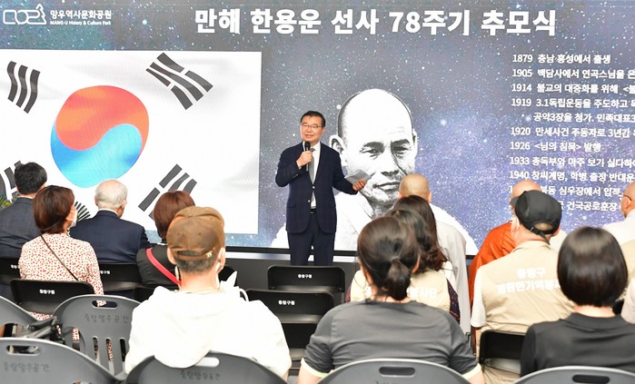 서울 중랑구는 29일 독립운동가이자 시인인 만해 한용운 선사의 제78주기 추모식을 열고, 선사가 영면한 망우역사문화공원에서 ‘님의 침묵’ 낭독과 추모사, 헌화 등의 순서로 추모식을 진행하며 선사의 숭고한 삶과 업적을 기렸다. 사진은 추모식에서 류경기 구청장이 인사말을 하고 있는 모습. (사진제공=중랑구청)